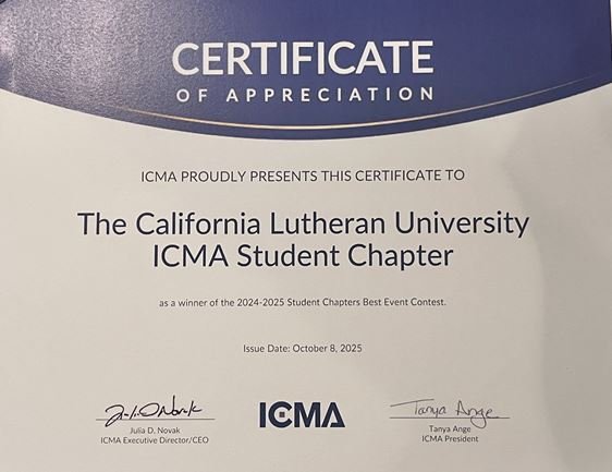 On October 8, the Cal Lutheran Chapter of the International City Managers Association (ICMA) was honored with the Best Event by a Student Chapter Award during the 2024-25 academic year. Our gratitude goes to our students, alumni, and Sabith Khan, Program Director of our Master in Public Policy and Administration IMPPA) program. Congratulations!